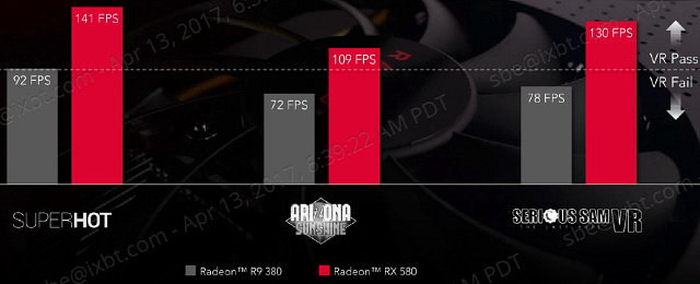 То же самое касается и приложений виртуальной реальности. Radeon RX 580 не просто обеспечивает бо́льшую производительность в VR-играх по сравнению с Radeon R9 380, но и делает многие из них играбельными в принципе, ведь виртуальная реальность для комфорта требует уже не 60 кадров в секунду, а все 90!