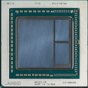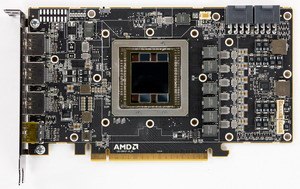Кристалл самого ядра получился весьма крупным (484 мм²), он объединен в одной упаковке с двумя кристаллами памяти. Этот тандем припаян к PCB с помощью 2088 BGA-контактов.