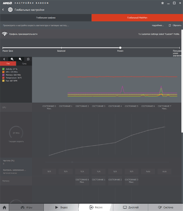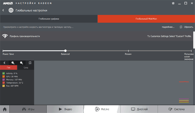 В настройках драйверов можно управлять режимом работы карты: Power Save (экономичный по питанию), Balanced (по умолчанию), Turbo (больше упор на производительность),