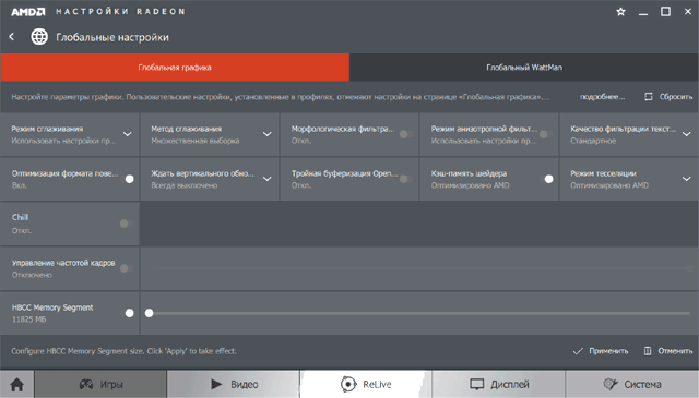 User (пользовательский). Также можно регулировать работу памяти HBM2 в качестве кэша (добавлять ОЗУ компьютера, делая HBM2 кэш-памятью верхнего уровня: это бывает полезно,