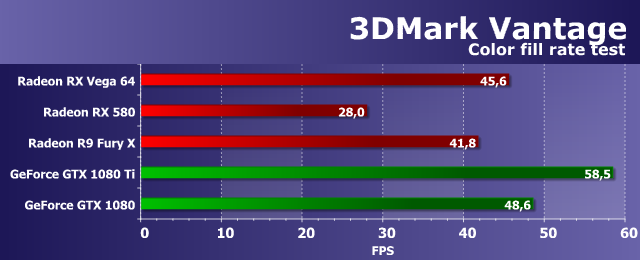 Синтетические тесты из пакета 3DMark Vantage могут показать нам другие результаты, на что мы и надеемся. Feature тесты из этого тестового пакета обладают поддержкой DirectX 10, до сих пор актуальны и интересны тем, что отличаются от наших и реже упираются в ПСП. При анализе результатов видеокарты Radeon RX Vega 64 в этом пакете мы наверняка сделаем какие-то новые и полезные выводы, ускользнувшие от нас в тестах из пакетов семейства RightMark.