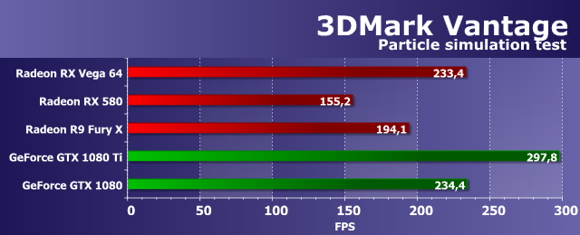 А вот во втором «геометрическом» тесте из 3DMark Vantage ситуация уже больше похожа на то, что мы видели в своих геометрических тестах. В этом тесте симуляции физики для частиц, видеокарта Radeon RX Vega 64 показывает результат на 20% лучше, чем Radeon R9 Fury X, и на 50% лучше Radeon RX 580 — это далековато до теоретической разницы, но куда ближе к истине, чем в предыдущем тесте. Новинка компании AMD показала результат ровно такой же, что и её конкурент GeForce GTX 1080, и обе они уступили разве что более дорогой GTX 1080 Ti.