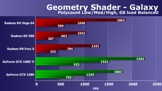 Изменение балансировки в тестах геометрических шейдеров не влияет на конечный результат рендеринга, итоговая картинка всегда абсолютно одинакова, изменяются лишь способы обработки сцены. Параметр «GS load» определяет, в каком из шейдеров производятся вычисления — в вершинном или геометрическом. Количество вычислений всегда одинаково.
