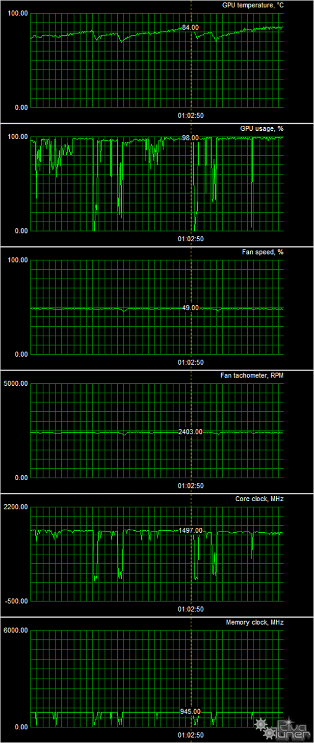 В режиме максимальной нагрузки в 3D температура достигала уровня 84 °C, частота вращения вентилятора вырастала до 2403 оборотов в минуту, уровень шума поднимался до 45,6 дБА.