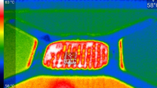 Максимальный нагрев 83 градуса — на печатной плате с обратной стороны в районе ядра.