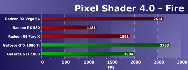 Рассмотрим второй тест шейдерных вычислений, который носит название Fire. Он тяжелее для ALU, и текстурная выборка в нем только одна, а количество инструкций типа sin и cos увеличено вдвое, до 130. Посмотрим, что изменилось при увеличении нагрузки: