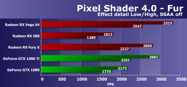 Первым тестом пиксельных шейдеров будет Fur. При самых низких настройках в нем используется от 15 до 30 текстурных выборок из карты высот и две выборки из основной текстуры. Режим Effect detail — «High» увеличивает количество выборок до 40—80, включение «шейдерного» суперсэмплинга — до 60—120 выборок, а режим «High» совместно с SSAA отличается максимальной «тяжестью» — от 160 до 320 выборок из карты высот.