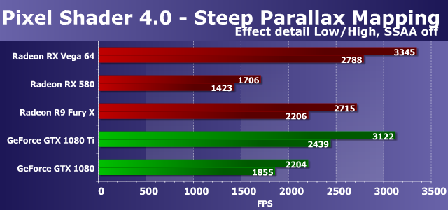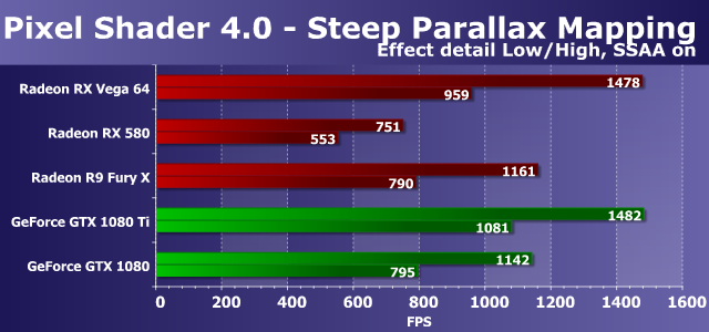 Более сложный режим не слишком сильно изменил соотношение сил в нашем сравнении, разве что старшая GeForce теперь стала быстрейшей в сравнении, обогнав сегодняшнюю новинку. Впрочем, графические решения AMD Radeon и в этом D3D10-тесте пиксельных шейдеров работают эффективнее конкурирующих плат GeForce, хотя ускорители Nvidia, основанные на архитектуре Pascal, почти догнали своих соперников. Сегодняшняя героиня показала результат, точно соответствующий теории, обогнав Fury X на 21-27% и Polaris на 75-97%.