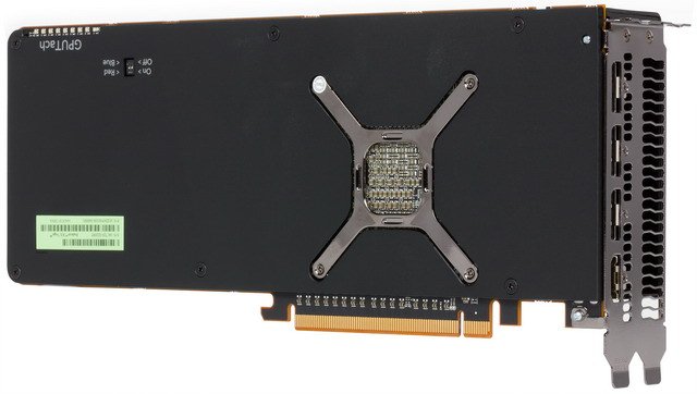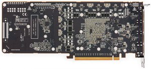 Силовые транзисторы охлаждаются пластиной, прижимающейся к основному радиатору. На обороте видеокарты установлена