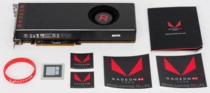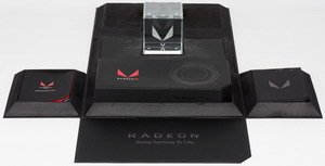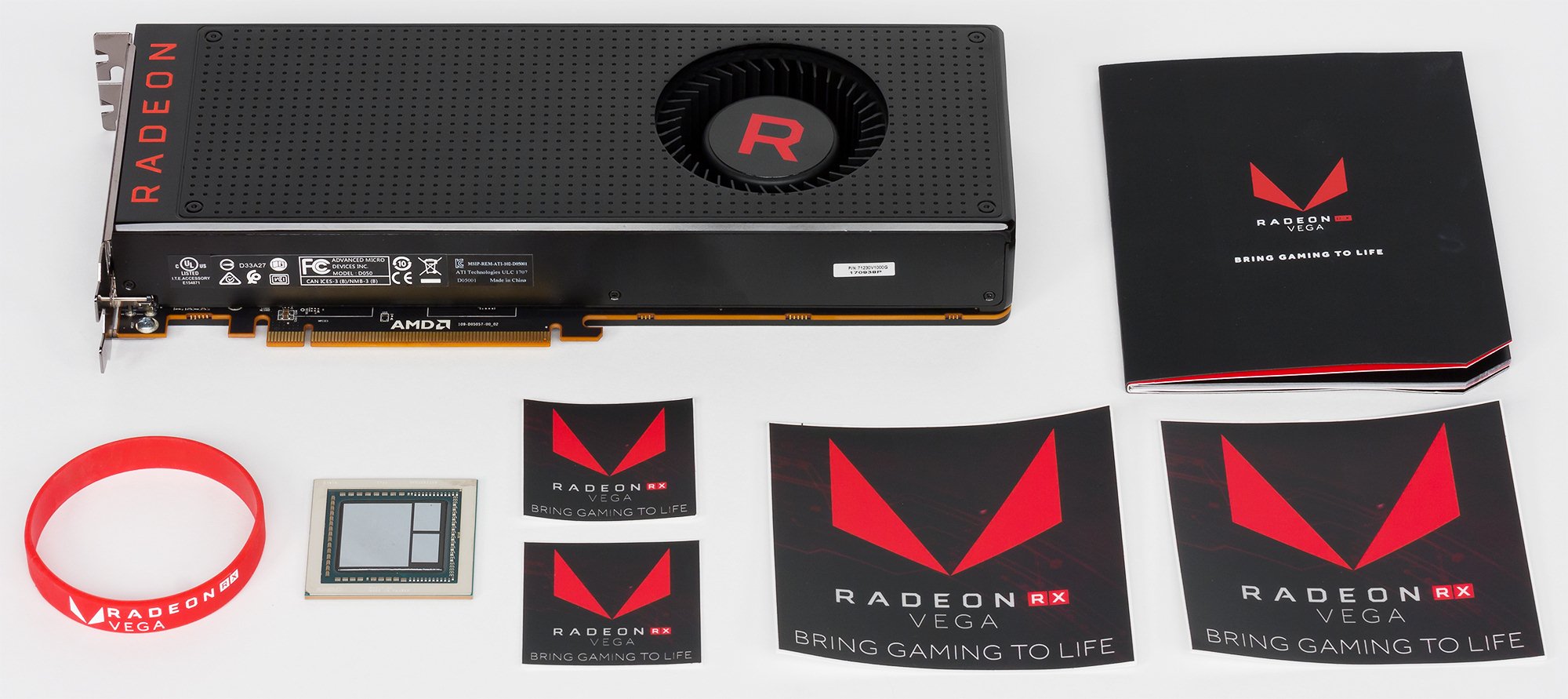 Компания AMD для нового продукта создала просто фантастический комплект, куда кроме карты вошли буклеты, копия реального GPU Vega10, сувенир с логотипом Vega, фирменный браслет и