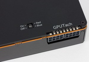Около разъемов питания имеется 8 светодиодов, которые информируют о загруженности GPU. Там же рядом есть переключатели, с помощью которых можно поменять цвет индикации (красный или