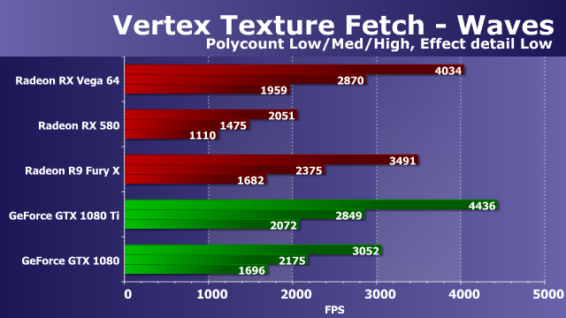 Результаты во втором тесте вершинного текстурирования «Waves» не во всём похожи на то, что мы видели на предыдущих диаграммах, так как решения Nvidia тут явно медленнее. И Radeon RX Vega 64 теперь конкурирует скорее с GeForce GTX 1080 Ti, чуть-чуть не доставая до неё. Скоростные показатели новинки AMD в этом тесте явно лучше других решений, кроме топовой платы Nvidia, и разница в производительностью между новой видеокартой и RX 580 почти достигла двукратной, а вот Fury X снова медленнее лишь на 16-21%, что меньше теоретической разницы. Похоже, что в тестах вершинного текстурирования Vega не получает преимуществ от архитектурных улучшений. Рассмотрим второй вариант этой же задачи: